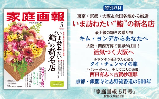 株式会社世界文化社は、『家庭画報 5月号』を4月1日(火)(通常版のみ関西・東海地区は3月31日)に発売します。巻頭特集「いま訪ねたい‟鮨”の新名店」では、東京・京都・大阪を中心に、技も価格も‟真っ当”な全国各地の名店を厳選してご紹介。「キム・ヨンデからあなたへ」では、ジュエリーを纏った俳優のキム・ヨンデさんからのメッセージをお届けします。さらに、活気づく大阪やタイ・チェンマイの探訪、バレーボール「西田有志×古賀紗理那」のスペシャルインタビュー、「志野流香道の家元継承式」の独占取材など、風薫るさわやかな季節に活気をもたらす企画が盛りだくさんです。