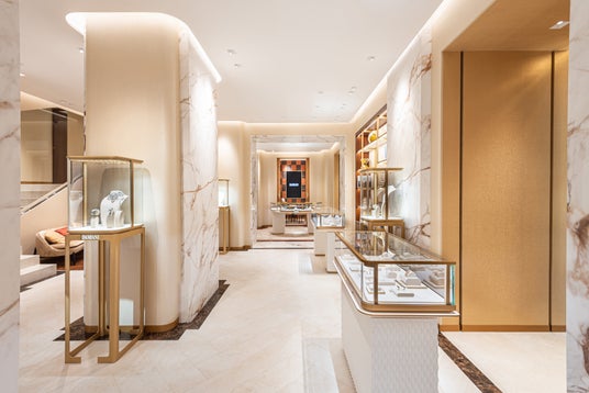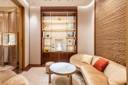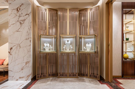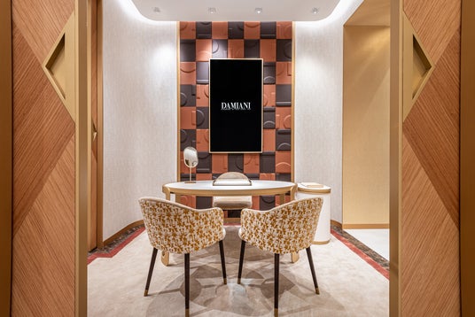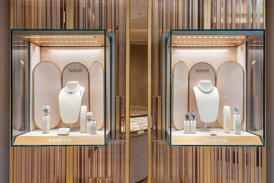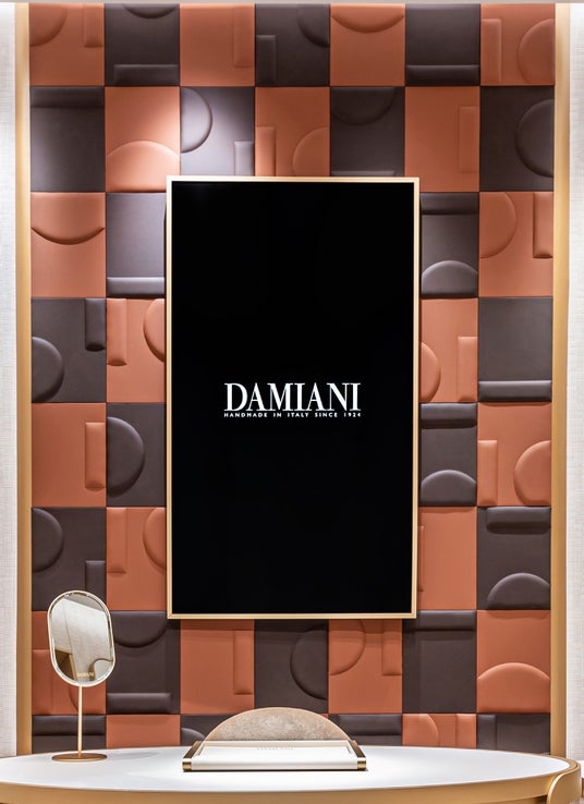 メゾンの特徴的な色彩であるゴールドを基調とし、温かみのあるベージュとブラウンを加えたカラーパレットなど、すべてがエレガンスを表現しています。また、ショップのウィンドウや店内のディスプレイ、スクリーンプリントされたガラス、円形と長方形が交互に配された店内の装飾壁など、ゴールドは、アイコニックなベル エポック コレクションの特徴的なモチーフと呼応し、ダミアーニの世界と本質的に結びついたスタイル要素となっています。