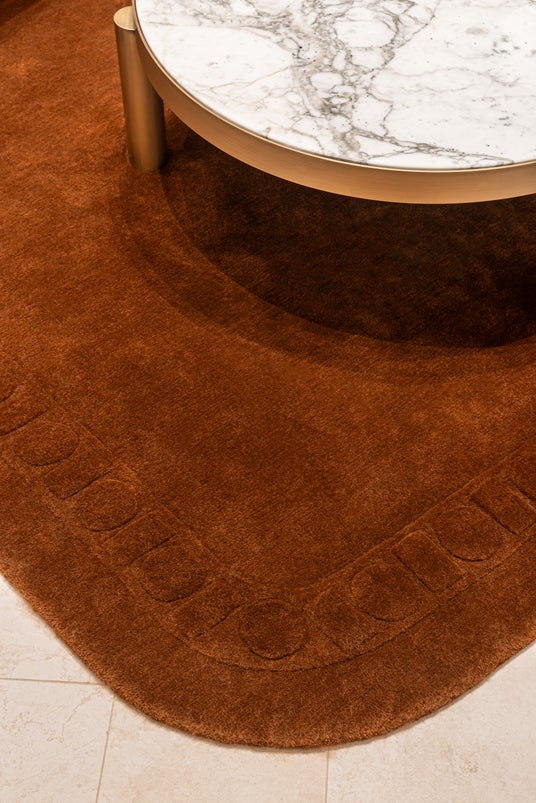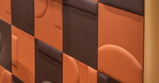 この象徴的なデザインは、洗練されたブラウンのカーペットや、ブラウンとオレンジが交互に配されたVIPルームの市松模様の壁にも反映されています。