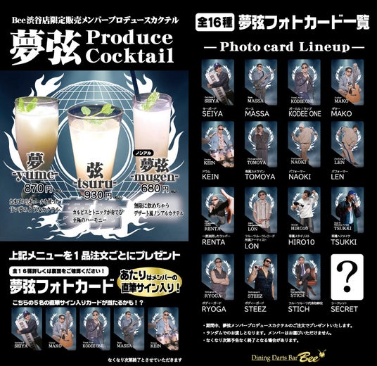また、LIVE当日、Valuence INFINITIESの公式応援店舗である、ダイニングダーツバー Bee渋谷店でLIVEイベントにちなんだキャンペーンを開催!「夢弦」メンバープロデュースの期間限定ドリンクの販売や店内のサイネージ映像がすべてINFINITIESに切り替わるなど、盛りだくさんの内容となっています。この日限りの特別なライブパフォーマンスとコラボイベントをお見逃しなく。