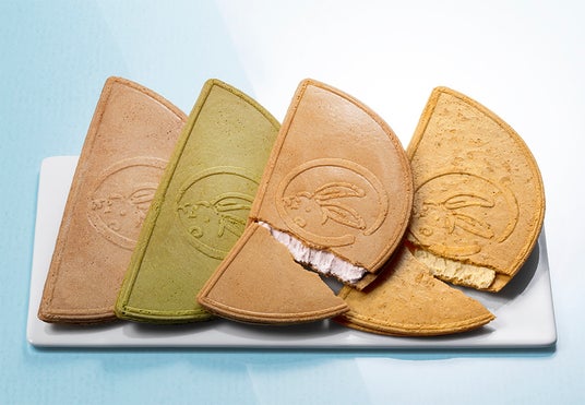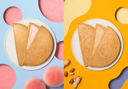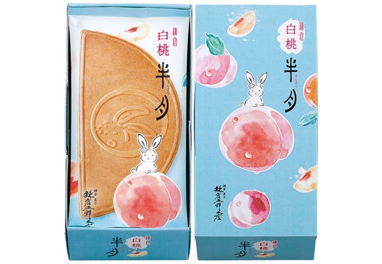 『鎌倉半月』は、愛らしい月うさぎを描いた大きな半月型のゴーフレットに、ふわっと軽いクリームをたっぷりはさんだ「鎌倉五郎本店」のロングセラー。そんな『鎌倉半月』から、「白桃」と「ぴーナッツ」2種類の味わいが夏季限定で登場です。