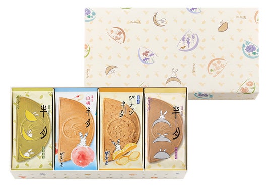 期間限定の『鎌倉白桃半月』『鎌倉ぴーナッツ半月』に、定番2種類(小倉風味・抹茶風味)が入った4種詰合せも登場です。ほのかに甘い生地とクリームに、細かく挽いた小豆と抹茶を練りこんで、豊かな風味を吹き込んだ「半月」定番の味わい。鎌倉銘菓『鎌倉半月』を存分に満喫できる、この時期だけのお詰合せをぜひどうぞ。