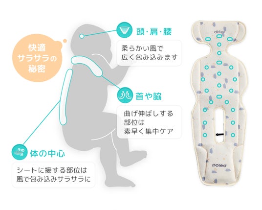 頭や首、脇や腰やお尻、太ももや膝裏までそれぞれ適正な風を送ることで、温度変化に敏感なお子様の体温を急激に低下させることなく快適に保ちます。