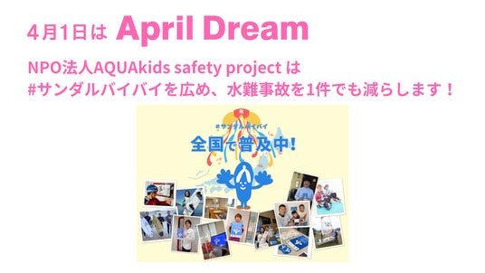 April Dreamは、4月1日を「夢を発信する日」として、企業や団体が本気で叶えたい夢を発信するプロジェクトです。私たちAQUAkids safety projectは、水辺の事故を防ぐための啓発活動「サンダルバイバイ」を全国に広め、水難事故を1件でも減らすことを目指しています。
