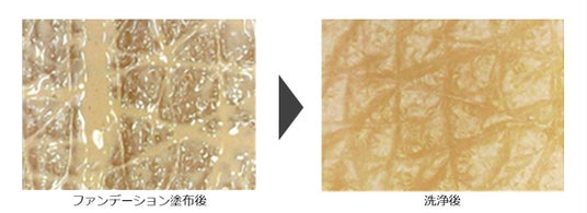 ファンデーションを塗布した肌へ10秒間ミストを吐水し、肌のきめに付着したファンデーションの洗浄を確認しました。