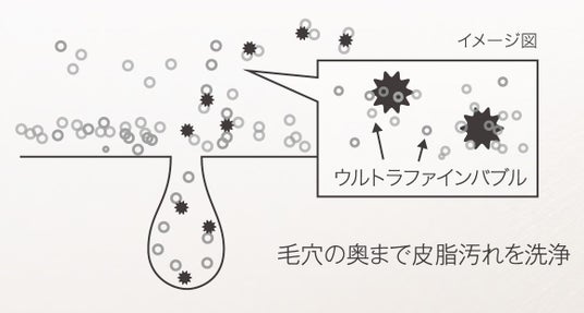 肌への刺激を抑えながらも、ウルトラファインバブルを含む独自水形による洗浄力が皮脂やメイク汚れをしっかり洗い流します。洗浄力と肌への刺激を考慮し、センシティブミストは顔から15~30cm程度離しての使用を推奨しています。ウルトラファインバブルは、毛穴(一般的に直径0.2mm)の奥まで入り込めるような超極小(直径1µm未満)の気泡です。物などへの吸着作用 (界面活性作用)があるとされ、様々な分野の「洗浄」に活用されています。