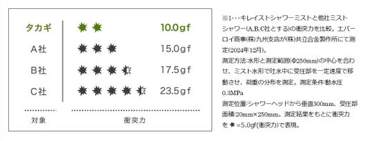 ※6・・・試験方法: プラスチック段ボール(黒)にキレイストシャワーミスト/当社従来型シャワー [JSB021]を吐水し、最大温度を測定する。測定条件:水温40±2℃、通水条件:8L/min、通水時間:10s、測定環境温度/湿度:21℃(吐水面が環境温度以下になったことを確認した後に吐水開始した)
