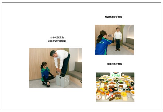 「からだ測定会」は、食を通じて社員の健康を支援する企業様に向け、身体の健康面でもサポートすることで、食と健康で社員の活力向上を支援するサービスです。このサービスでは、専用の機械を用いて6種目の運動能力を測定する「体力測定」や、AIによる姿勢分析「AI未来姿勢」、食品サンプルを使って最適な食べ方を学ぶ「食事診断」などを実施します。これにより、従業員の健康維持や健康意識向上を支援します。