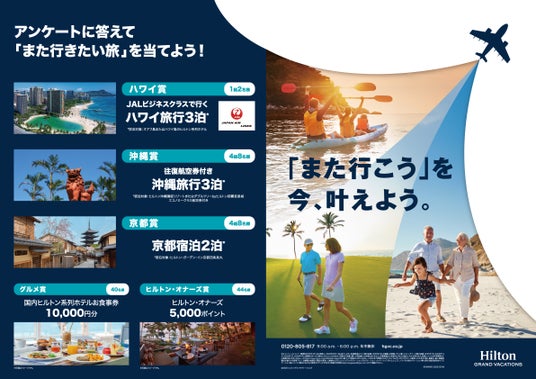プレミアバケーション・オーナーシップ&エクスペリエンスカンパニーであるヒルトングランドバケーションズ(NYSE: HGV、以下HGV)は、ヒルトングランドバケーションズで毎年実施している「アンケートに答えて『また行きたい旅』」を当てよう!」キャンペーンを今年も実施いたします。
