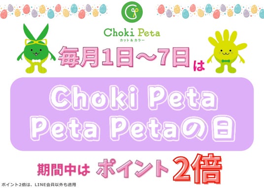 美容室チェーンを約350店舗展開する株式会社アルテジェネシス(横浜市中区/代表取締役社長 吉村 栄義)のグループ会社である株式会社C&P(横浜市中区/代表取締役社長 高橋 篤)が展開するカット&カラー専門店「チョキペタ」は、ヘアカットの日(4月5日)を含む4月1日~4月7日の一週間、『春の身だしなみ!チョキペタウィーク』を開催いたします。期間中にご来店のお客様を対象にポイント2倍(※1)、また、 LINE会員様向け(新規登録可能)にお得なクーポンを配布いたします。