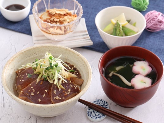 初鰹の季節、直火で豪快に炙った鰹を漬けにして、香味野菜と共に丼ものに仕上げます。真砂和えはタラコを使った和え物で、ウドとアスパラガスのやさしい色合いが春らしい一品です。汁物とデザートもついた、短時間でも食べ応えのあるコースです。