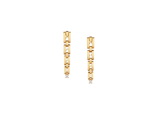 新作のネックレス、ピアス、ブレスレットはそれぞれ、プレーンな18Kイエローゴールド製。「ビー・ゼロワン ロック」のシグネチャーであるスタッズをあしらったネックレスには、エッジにブラックセラミックをインサートし、ロックテイストを加えています。ピアスは、チェーンモチーフが徐々に小さくなるデザインを取り入れ、下部に2石のダイヤモンドをあしらって輝きを添えています。