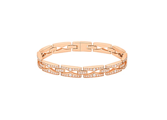 18Kピンクゴールドとホワイトゴールドのフルパヴェのブレスレットは、クラシックなダイヤモンドジュエリーを個性的に演出します。大胆不敵なデザインにまばゆい輝きを添えたブレスレットは、既存の同じスタイルのネックレスやピアスと合わせて着用することができます。