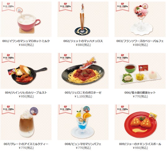 001/イワンのマシュマロホットミルク¥660(税込)002/ジェットのマッハチュロス¥880(税込)003/フランソワーズのベリーパルフェ¥880(税込)004/ハインリヒのカリーブルスト¥950(税込)005/ジェロニモのボロネーゼ¥1,100(税込)006/張々湖の飲茶セット¥770(税込)007/グレートのアイスミルクティー¥770(税込)008/ピュンマのマリンパフェ¥770(税込)009/ジョーのチキンライスボール¥950(税込)