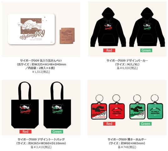 サイボーグ009 缶入り瓦せんべい(缶サイズ:約W225×H148×D40mm/内容量:2枚入×6袋)¥1,512(税込)サイボーグ009 デザインパーカー(サイズ:M/L/XL)各¥6,930(税込)サイボーグ009 デザイントートバッグ(サイズ:約H365×W360×D110mm)各¥3,410(税込)サイボーグ009 織キーホルダー(サイズ:約W60×H65mm)各¥748(税込)