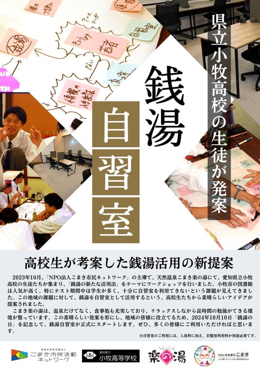 例えば、使い道のない『柿』を用いた柿湯イベントや、小牧高校の生徒たちと協力して自習室を設置する取り組みを行い、地域に根ざした新しい温浴体験を提供しています。