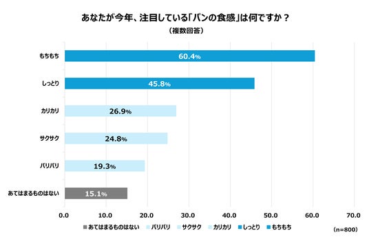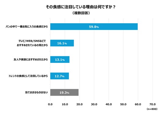 さらに、今年注目している「パンの食感」について尋ねたところ、第1位「もちもち(60.4%)」、第2位「しっとり(45.8%)」という結果となり、その理由については、「お気に入りの食感だから」という回答が多く、中には「テレビ/WEB/SNSなどでおすすめされているのを見たから」「トレンド食感として注目しているから」など、世間で話題になっており、流行りの食感として注目している人がいることも明らかになりました。