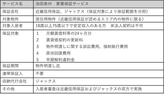 株式会社ジャックス(本部:東京都渋谷区、代表取締役社長:村上 亮、以下「ジャックス」) は、株式会社池田泉州ホールディングス(本社:大阪府大阪市、代表取締役社長兼 CEO:鵜川 淳、以下「池田泉州ホールディングス」)のグループ会社である近畿信用保証株式会社(本社:大阪府大阪市、代表取締役:井上 愼治、以下「近畿信用保証」)と連携し、2025年4月1日より「池田泉州 家賃保証サービス」の取り扱いを開始いたします。