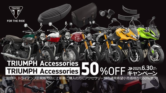 4月1日(火)~6月30日(月)までの期間中、トライアンフ正規販売店にて新車ご購入の注文時に、ご購入車両に適用の車体アクセサリー類を一緒にオーダーすると、アクセサリー類の通常希望小売価格から50%オフで新車にアクセサリーパーツを取り付けることが可能となります。