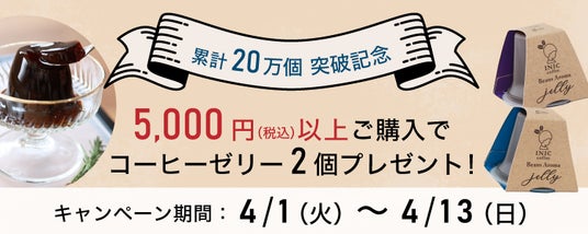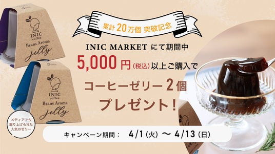 日頃のご愛顧に心より感謝申し上げ、「コーヒーゼリー累計20万個突破記念キャンペーン」を2025年4月1日(火)から実施します。2025年4月13日(日)までの期間中、オンラインストア「INIC MARKET」で5,000円(税込)以上お買い上げいただいたお客様全員に、「Beans Aroma コーヒーゼリー」を2種類プレゼントします。