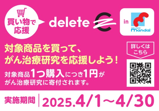 認定NPO法人deleteC(デリート・シー / 代表理事:小国 士朗)と関西エリアを中心にスーパーマーケットを展開している株式会社万代(本社:大阪府東大阪市 / 代表取締役社長:阿部 秀行)は、ふだんの暮らしの中で、がん治療研究を応援する取り組みとして、2025年4月1日(火)~4月30日(水)の期間中、買い物ががん治療研究の寄付につながる「買い物ががん治療研究の応援に!in 万代」企画をスーパーマーケット「万代」の全169店舗にて実施します。