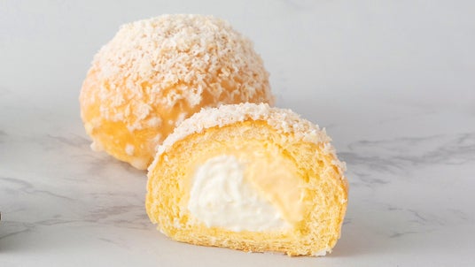 しっとりふんわり柔らかな生地の中に、レアチーズクリームとカスタードクリームを2層仕立てで入れ、表面にはココナッツをふりかけました。斬新な見た目に加えて、レアチーズの風味とココナッツが相性良くもう1つ食べたくなるようなミニくりーむパンです。