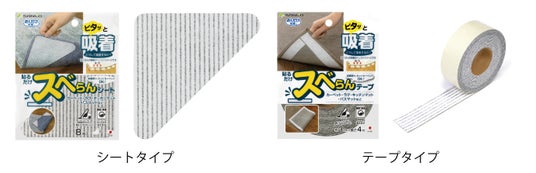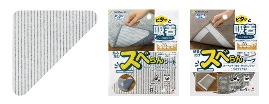 「貼るだけスベらん」シリーズは、リビングやキッチンのマットの裏側に貼るだけでズレを防ぎます。角に貼りやすい三角形の「シートタイプ」と、好きな長さにカットして使用できる「テープタイプ」の2種類を展開。どちらも厚さ約1.5mmの薄型で、マット裏に貼っても邪魔になりません。また、貼ったまま洗濯も可能で、洗濯後も吸着力は持続します。
