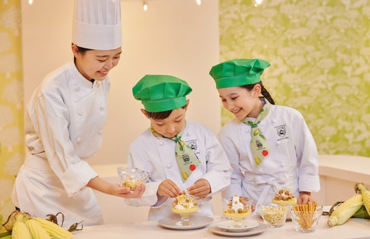 リゾナーレキッズスタジオでは、規格外品の野菜について楽しく学んで作る「サステナブルキッズスタジオ」を開催します。「規格外品の野菜とはどんな野菜か」や「販売できない野菜はどうなるか」などを学んだ後、規格外品のとうもろこしを使用した「とうもろこしのプリン」に、クリームを絞ったり、ポップコーンをのせたりして自分好みのトッピングを楽しめます。規格外品でも美味しく食べられることを楽しく学べるプログラムです。