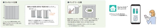 「エアレ」はこのたび電動仕様に対応し、より快適にお使いいただけるようになりました。電動の『ホームタコス エアレ』は、「コンセント仕様」と「バッテリー仕様」 の 2 種類からお選びいただけます。コンセント仕様は、電源プラグをコンセントに差し込むだけですぐに使用可能。1つの電源から最大10台接続できる「電源分岐ジョイント」仕様を選べば、連窓時にもおすすめです。バッテリー仕様は、窓の近くにコンセントがない住宅やマンション、リフォーム時の窓まわりの掛け替えにも適しています。また、バッテリーを内蔵しているため停電時でも操作が可能で安心してご利用いただけます。1回の満充電(約3時間)で約 3 か月※使用可能です。さらに、専用アプリ『HomeLink』を使用すれば、ホームタコスを含む対応家電・設備を一括管理でき、外出先からの遠隔操作も可能です。