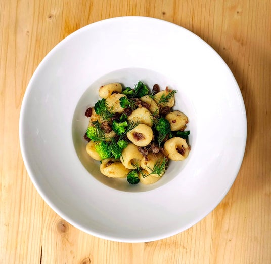 ポテトのニョッキとブロッコリー、ポークソーセージ、レーズン、ディルが調和したユニークな味わい。もちもち食感のニョッキに、ほどよい甘みと塩味が絶妙に絡み合います。