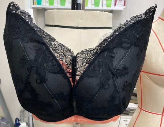Z85ブラは、既存のパターンを流用せず、すべてを一から設計。写真は黒レースの試作品で、立体的な縫製と繊細なレースが特徴。実用性と美しさを両立させた、まさに“構造美”。
