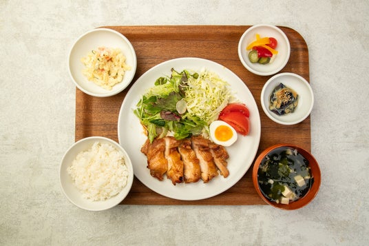 ・エスニック風照り焼きチキン(マカロニサラダ/自家製ピクルス/揚げ茄子の味噌和え/味噌汁)