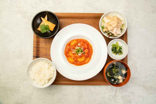 本場四川の海老チリに甘味を含ませたフレッシュトマトで整えました。蒸し鶏のバンバンジーをご一緒に召し上がりください。