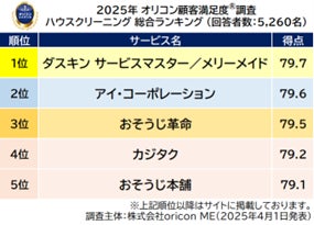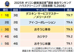 オリコン株式会社(本社:東京都港区 代表取締役社長:小池 恒、略称:オリコン)は、グループ会社である株式会社oricon MEが、実際のサービス利用者を対象に第三者の立場で実施した『ハウスクリーニング』の顧客満足度調査の結果を、2025年4月1日(火)14時に「オリコン顧客満足度(R)」公式サイト内にて発表いたしました。ランキングの結果は、下記の通りとなりました。