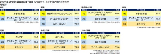『ハウスクリーニング』地域別ランキング(オリコン顧客満足度)