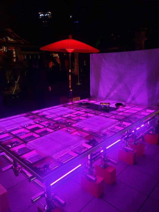 「光の舞台」が境内に出現!期間中、神田明神境内に「光の舞台」が出現し、特別な舞台でお点前を披露いたします。来場者にはお抹茶が振る舞われます。(*雨天時は文化交流館4階令和の間にて実施。)