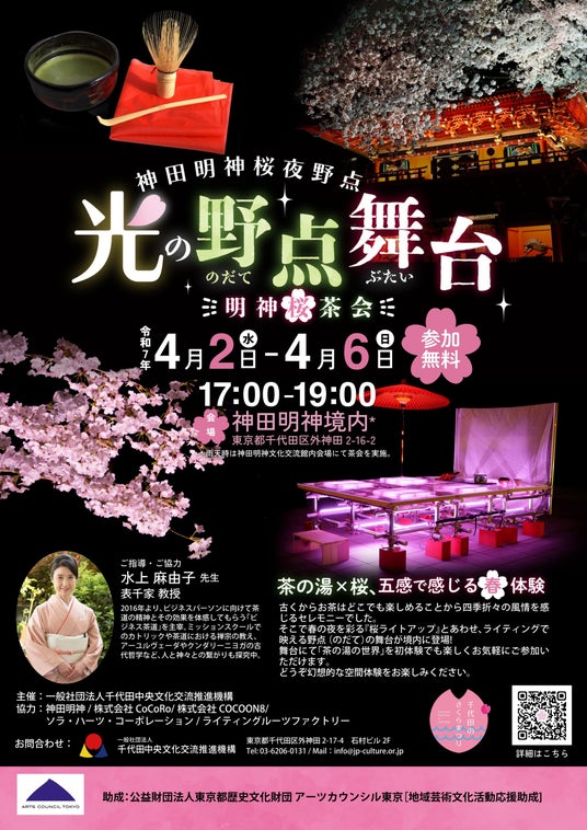 一般社団法人千代田中央文化交流推進機構(東京都千代田区)は、神田明神桜夜野点『光の野点舞台~明神桜茶会~』を令和7年4月2日~4月6日まで、神田明神境内にて開催します。