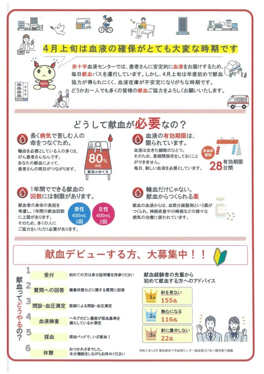 毎年、年度末から年度初めとなる3月から4月にかけては、法人や学校による集団献血の実施件数が減少し、これに伴い、この時期は安定的な血液の確保が難しい状況です。