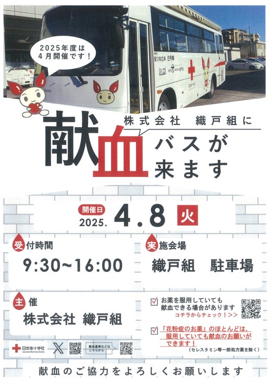 株式会社 織戸組(本社:川崎市中原区田尻町61番地、代表取締役社長:織戸一郎、以下「織戸組」)では、地元商店街や町内会のご協力の下、今年も集団献血を実施します!