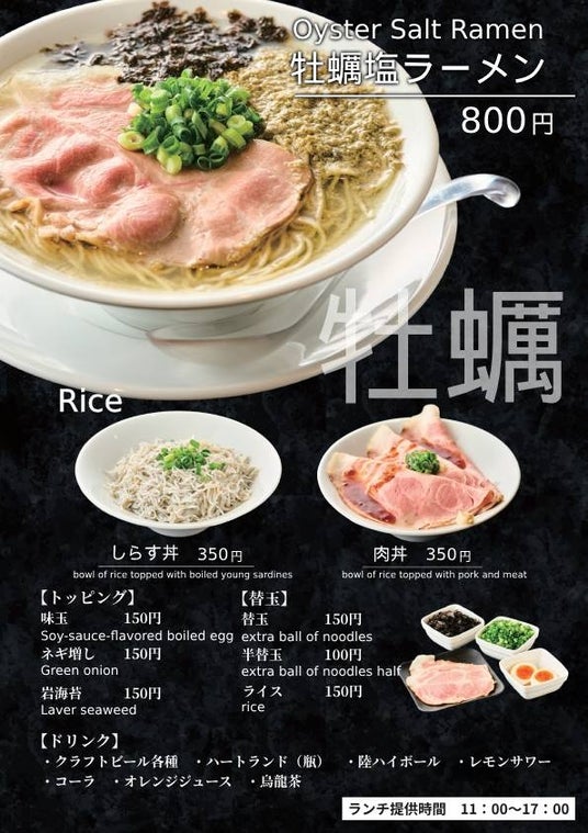 看板メニューの「牡蠣塩ラーメン」は、広島県産牡蠣を100%使用した濃厚スープで、ふわっと香る牡蠣の香りに、牡蠣アヒージョの旨みが広がり多くのファンを惹きつける至極の味!