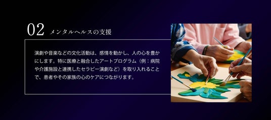 他にも、ストレス・孤独感軽減や認知機能向上といった力を持ち、身体的・精神的・社会的にさまざまな「健康」を創っている「文化」。このように、文化は単なる「生きるための手段」ではなく、私たちにとって欠かせない豊かな生活を作り上げるための礎であり、心と体の健康を支える力強い源であるといえます。私たちはこの「文化」を守り、次世代へと継承し、さらなる発展を遂げていくべく“生きるを満たす”劇場創生の幕をあげました。