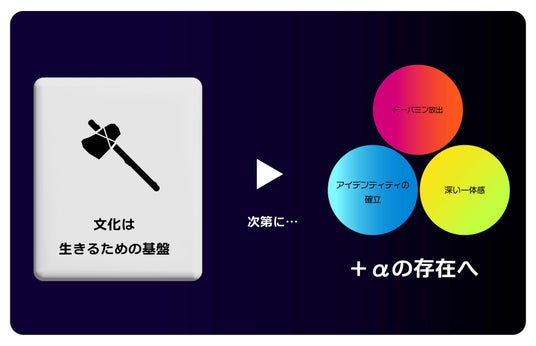 人類の進化の過程において、人々の結びつきは必要不可欠でした。しかし、それだけではなく、食料の確保方法や言語の獲得など、「生きるための基盤」として、文化が深く関わってきました。時が経つにつれて、文化はますます私たちの生活に重要な影響を与える存在へと進化しました。それは、もはや単なる生存のためだけでなく、私たちに「+α」をもたらすものへと変わったのです。