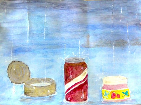 作品の説明:「海に流され、たどり着いたゴミたちが雨で音楽を奏でます」