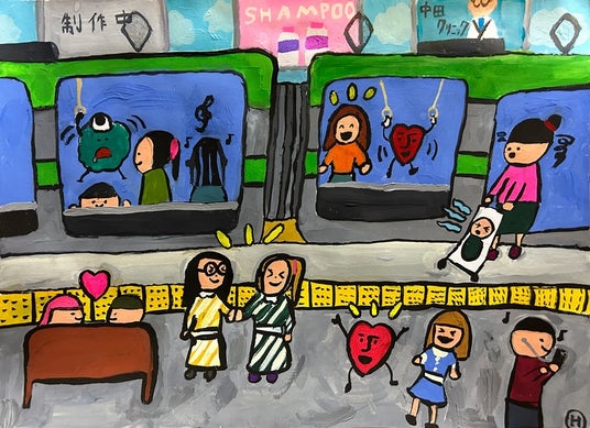 原宿駅で電車をまっている時、いろいろな人がいて、これが多様性だな、と思いました。そこで聞こえる音もいろいろで、音の多様性だなと思ってこの絵を描きました」