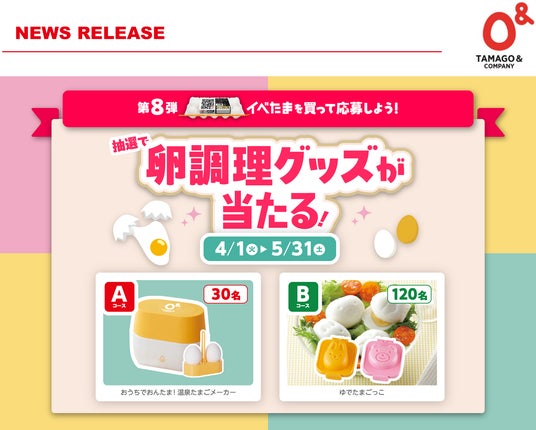 現在実施中の第8弾キャンペーンでは、たまごをもっと楽しく・美味しく召し上がってほしいという思いから、抽選で合計150名様に「卵調理グッズ」をプレゼントします!