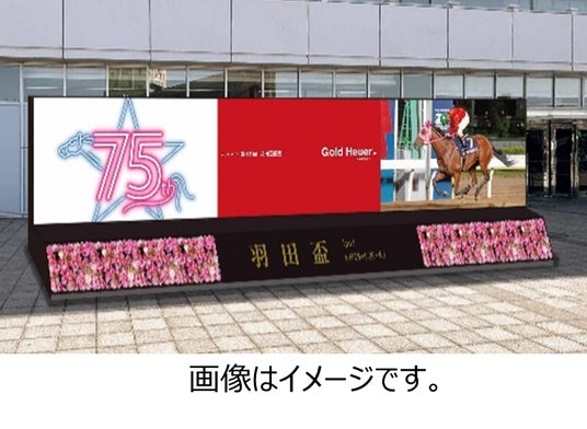TCK場内において、75周年を記念したモニュメントを展示します。モニュメントでは、モーショングラフィックスによるレース告知を映しだすほか、ブランドムービーや過去のレース映像の放映をいたします。