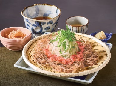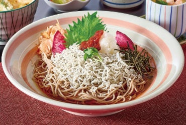 『梅としらすのおろしそば』 税込1,210円 しらすをたっぷり使い、サガミ自慢のおろしそばと組み合わせました。しらすと相性が良い梅肉を使用した山海ぶしを加え、最後までさっぱりと食べられる逸品です。