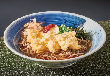 『純和鶏とり天梅おろしそば』 税込1,310円 純和鶏(R)むね肉をサクサク天ぷらに仕上げ3枚使用し、サガミ自慢のおろしそばと組み合わせました。梅肉を使用した山海ぶしを加え、ボリュームもありながら最後までさっぱりと食べられる逸品です。