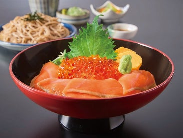 『サーモンいくら丼と麺』 税込2,140円 肉質が柔らかく深みのある味わいのアトランティックサーモンと、食感が良いいくらを贅沢に使用した豪華などんぶり。厳選したサーモンといくらが織りなすハーモニーは、一口ごとに贅沢な味わいを楽しめます。