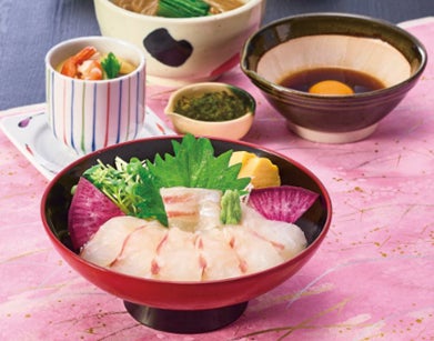 『宇和島風鯛めしと麺(お得な茶椀蒸し付)』 税込2,310円 愛媛県産活〆真鯛を使用しており、さっぱりした甘さの特製タレと卵黄の旨味が合わさり、ご飯との相性は抜群です。愛媛県の郷土料理をサガミのこだわりでアレンジした商品です。